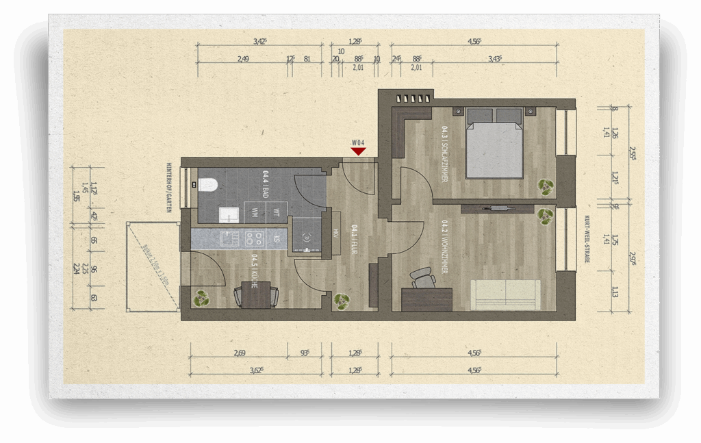 Die 2 Zimmer Wohnungen befinden sich im 1. OG, 2. OG, 3. OG und im Dachgeschoss.