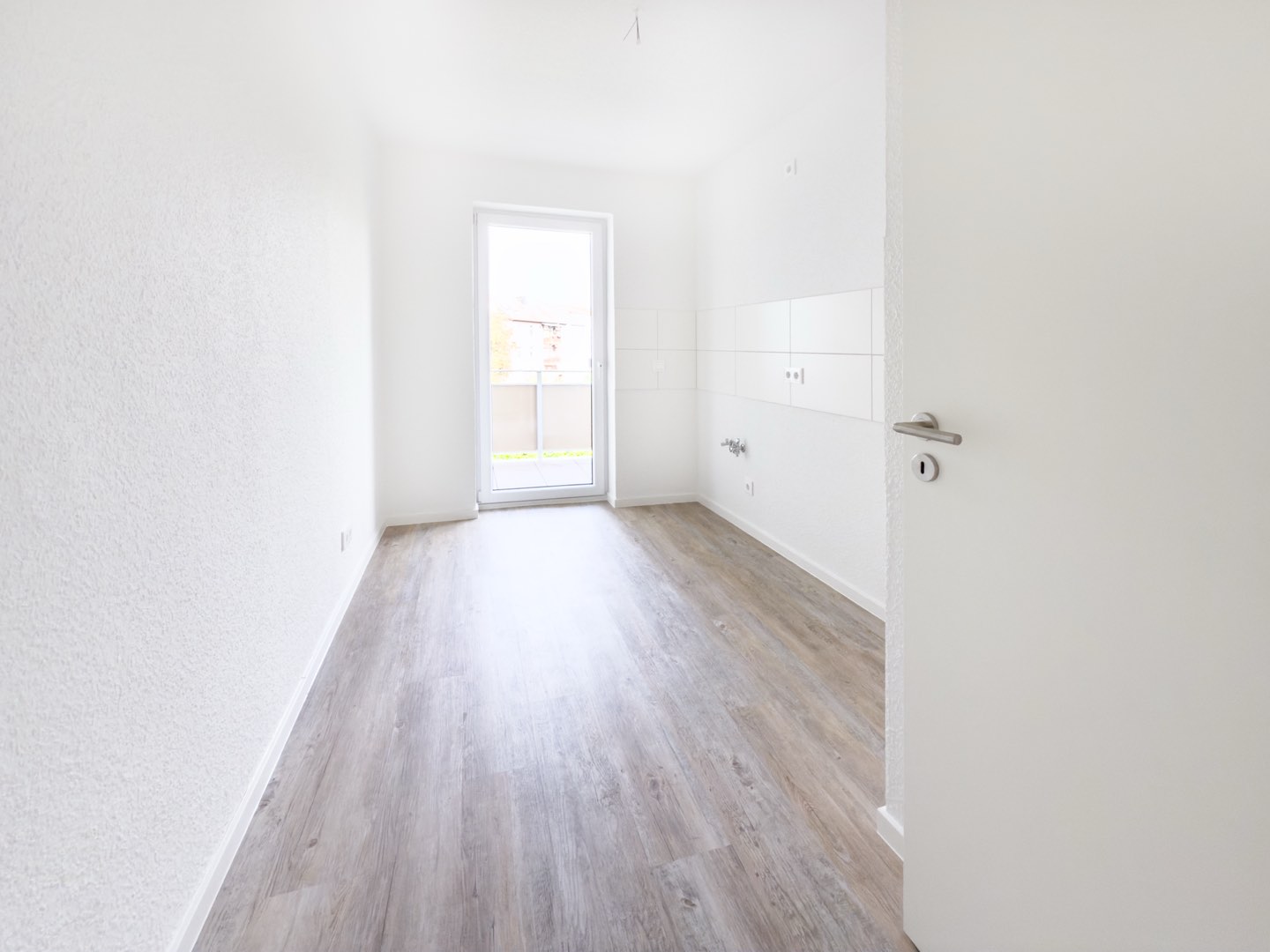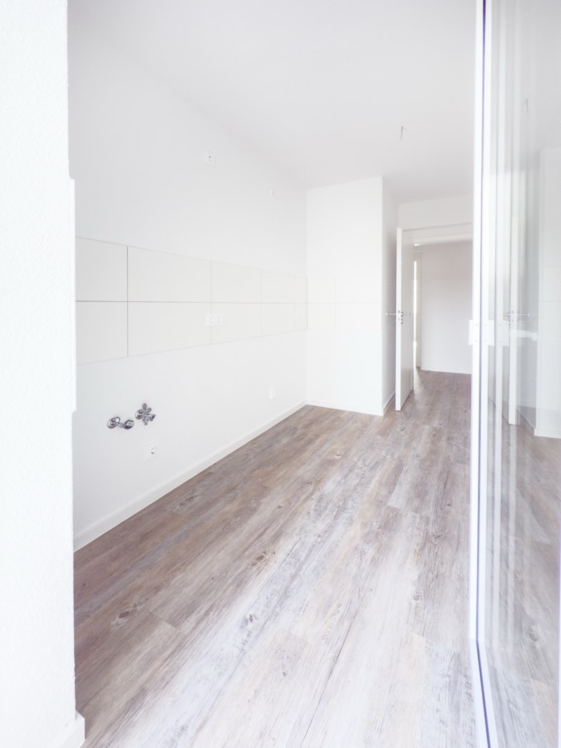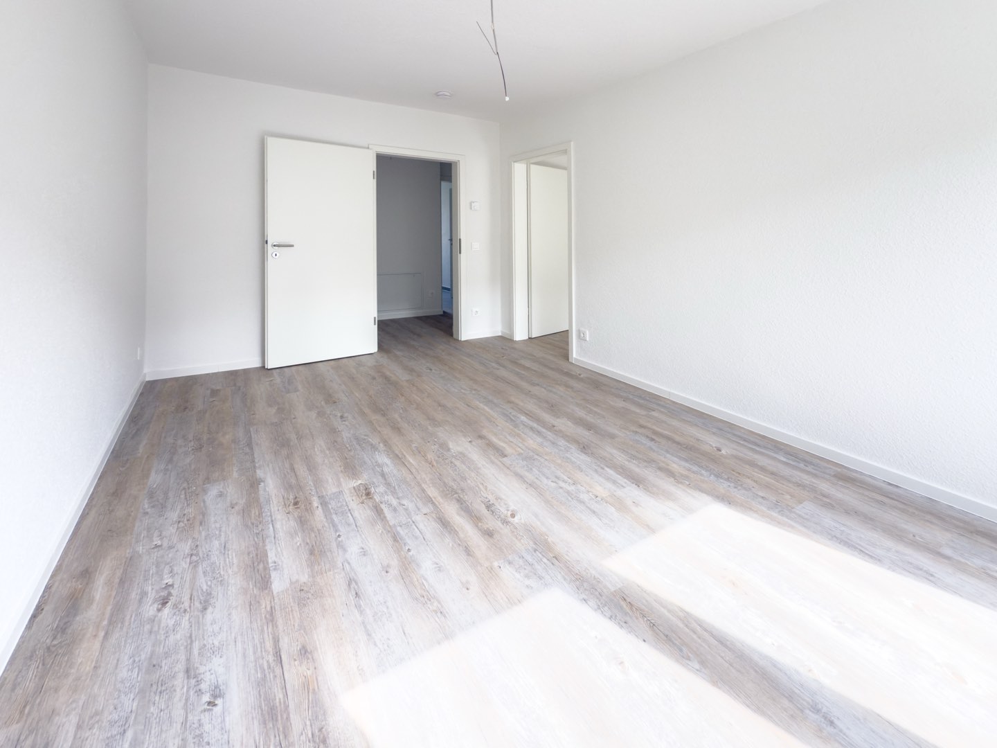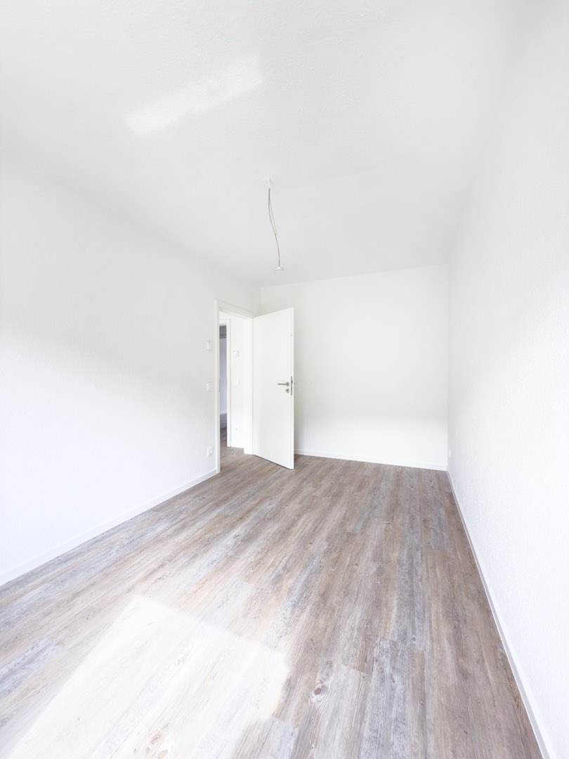 Der moderne Vinylboden in Holzoptik verleiht den Räumen eine warme Ausstrahlung, während die frisch renovierten Wände in weißer Raufasertapete für eine zeitlose Eleganz sorgen.