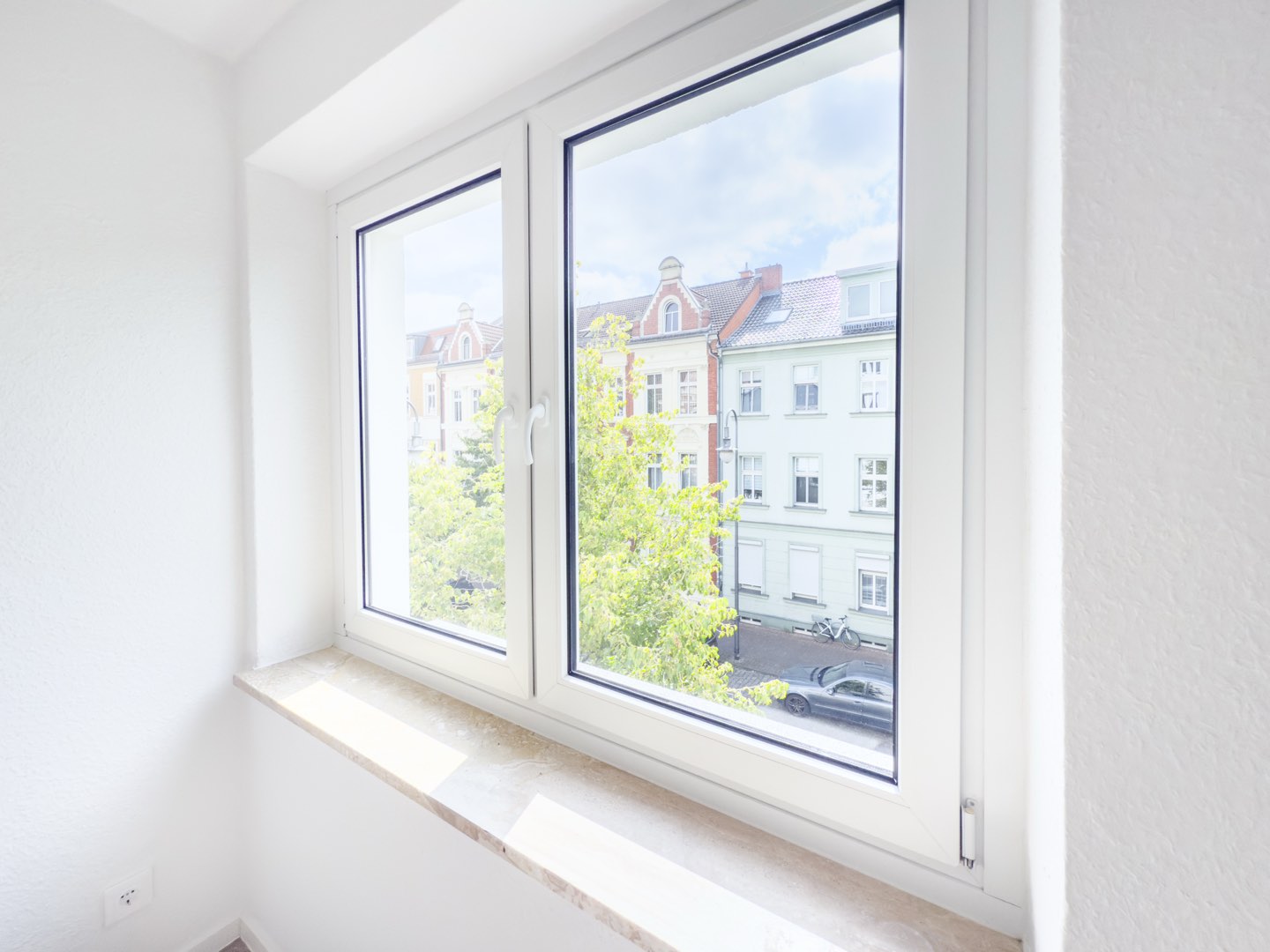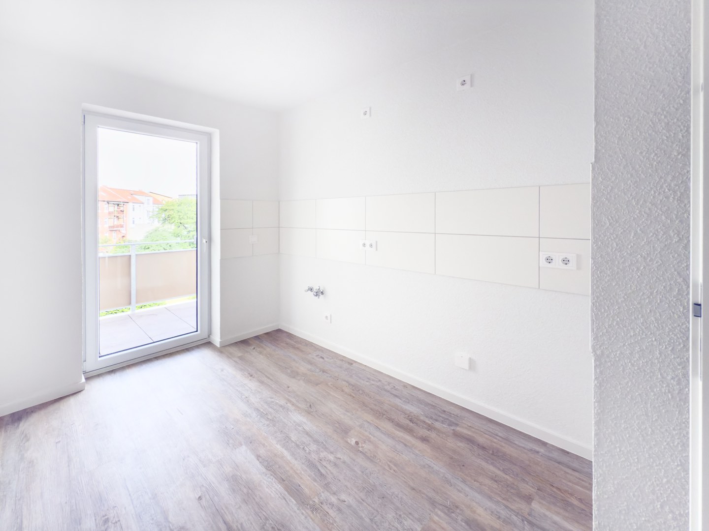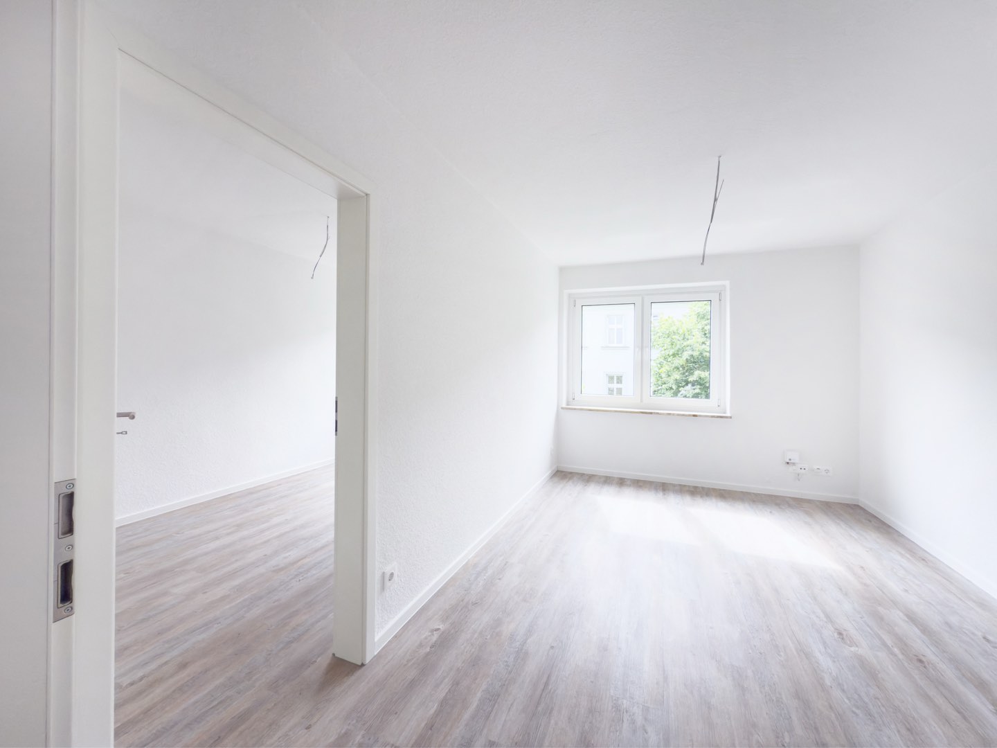 Der moderne Vinylboden in Holzoptik verleiht den Räumen eine warme Ausstrahlung, während die frisch renovierten Wände in weißer Raufasertapete für eine zeitlose Eleganz sorgen.